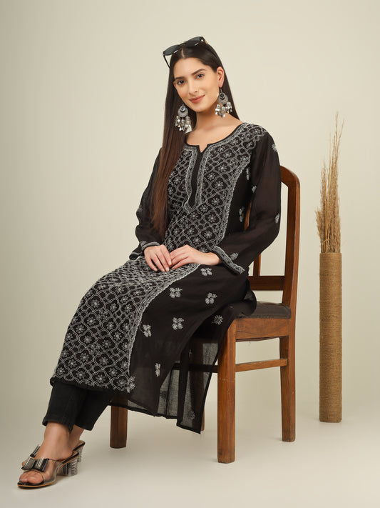 'Starry Night' Mul-chanderi Black Chikankari Long Kurti