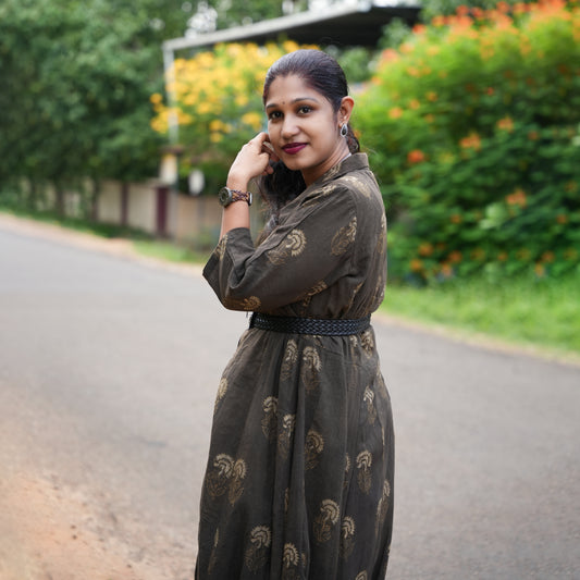 'Golden Marigolds' Cotton Brown Button Down Floor length dress
