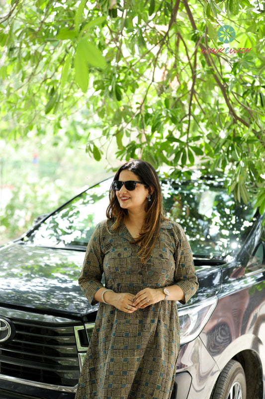 'Checkered Charm' Boho inspired Hand block printed Knee-length Dress