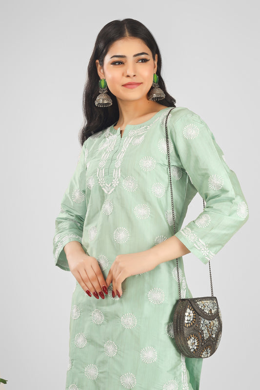 Pastel Green Silk Chikankari Kurta-Pant Set
