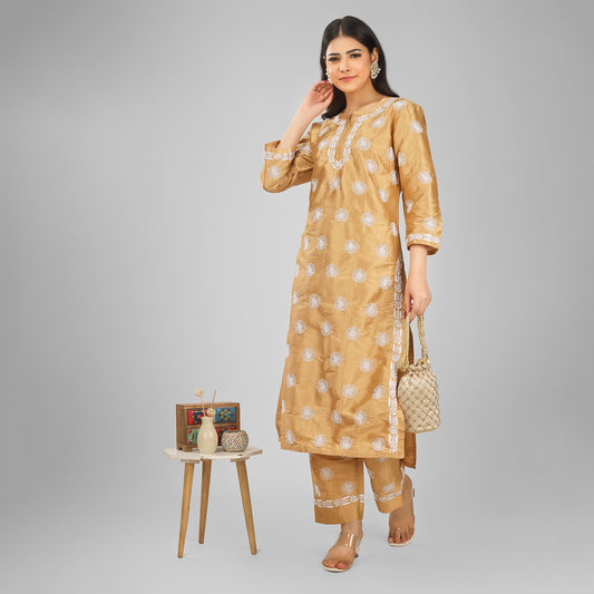 Ochre Brown Silk Chikankari Kurta-Pant Set