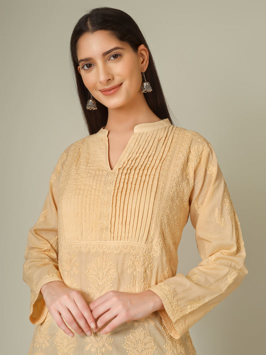 'Classy Beige' Pleated Band Neck Mul Cotton Chikankari Long Kurti