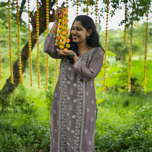 Bistre Brown Mul-Chanderi Chikankari Long Kurti