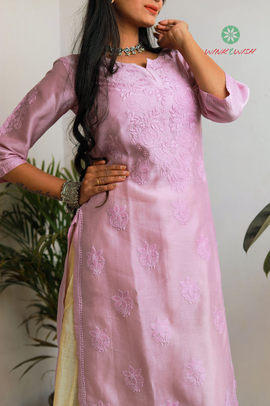 Lilac Rose pattern Chikankari embroidered Chanderi Kurti