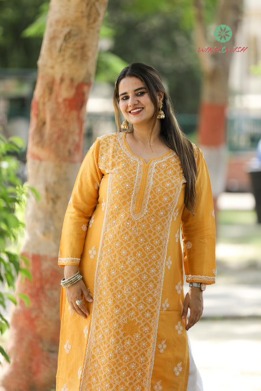 'Festive Warmth' Mul-chanderi Mustard Chikankari Kurti