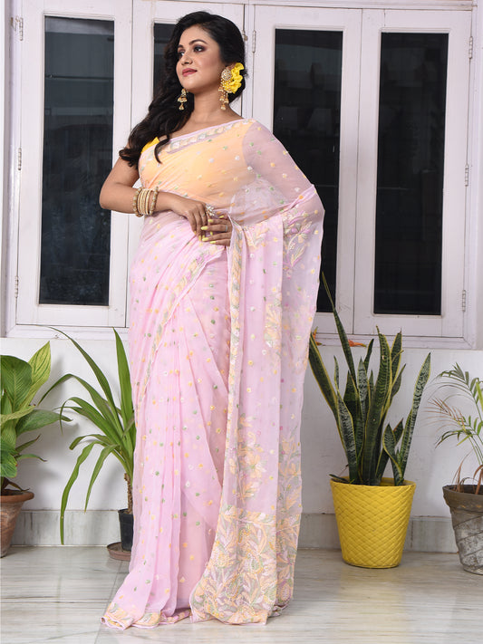 'Pink Rainbow' Georgette Chikankari Saree with multithread embroidery