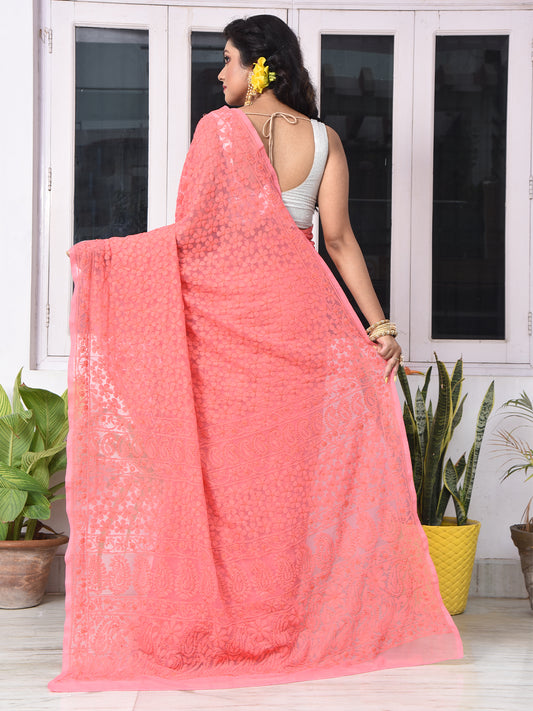 'Gulzaar' Coral Red Georgette Chikankari Saree