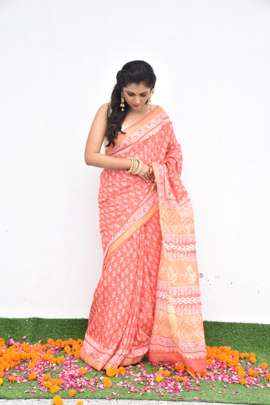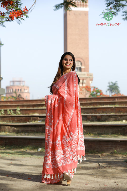 'Sun Kissed Bloom' Coral Red Mulmul Cotton Chikankari Saree
