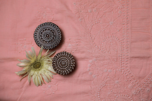 Nude Peach Mul Chanderi Unstitched Chikankari Suit Set