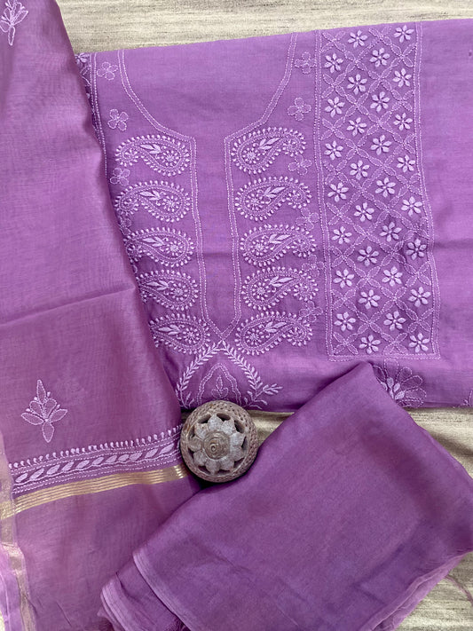 'Ash Lavender' Mul Chanderi Chikankari Unstitched Suit Set