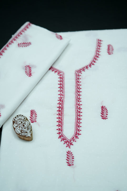 'Red Feathers' White Cotton Unstitched Chikankari Kurta Dupatta Set
