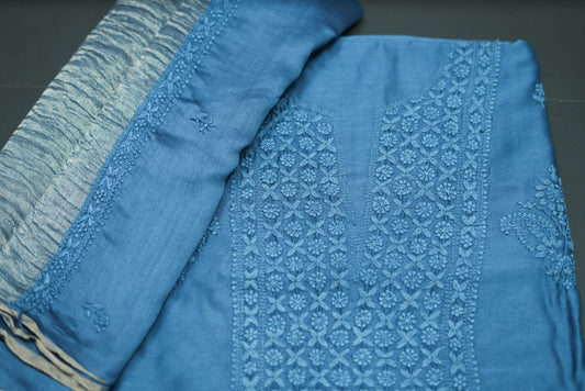 Navy Blue Blue Chanderi Unstitched Chikankari suit set