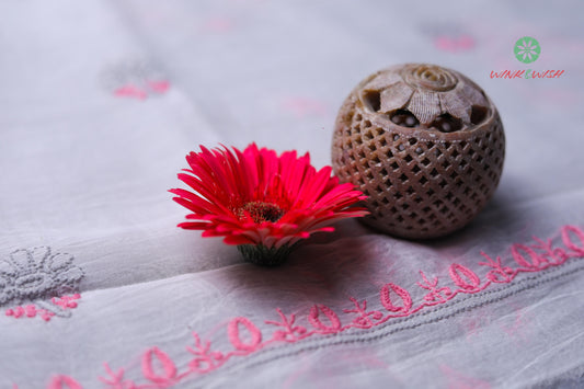 Pink & Grey thread embroidered White Mul Chanderi Unstitched Chikankari Suit Set