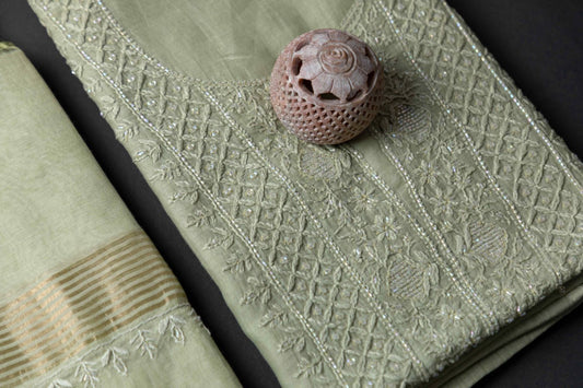 'Regal Charm' Olive Green Mul Chanderi Embellished Unstitched Chikankari Suit Set