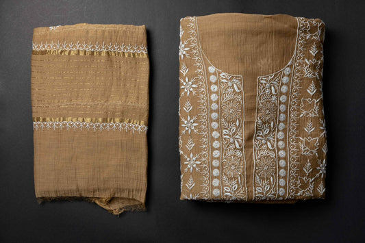 Ochre Brown Mul Chanderi Unstitched Chikankari Suit Set