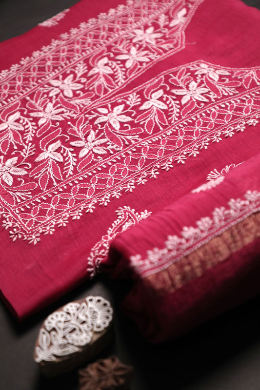 'Magenta Royale' Pink Hand-Embroidered Hand Embellished Mul Chanderi Chikankari Unstitched Suit Set