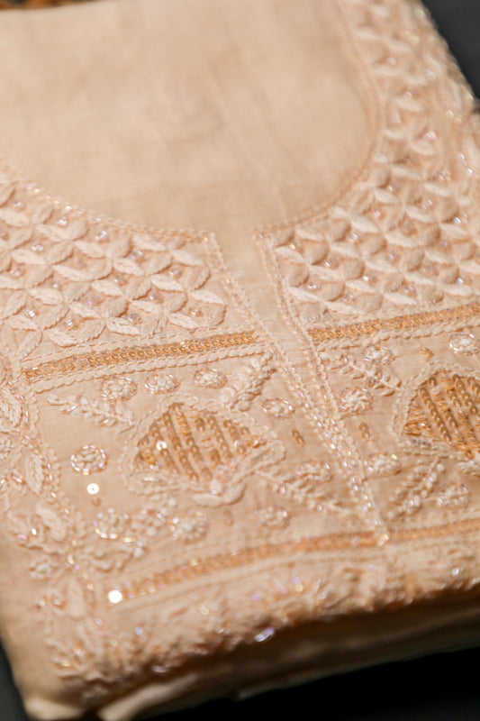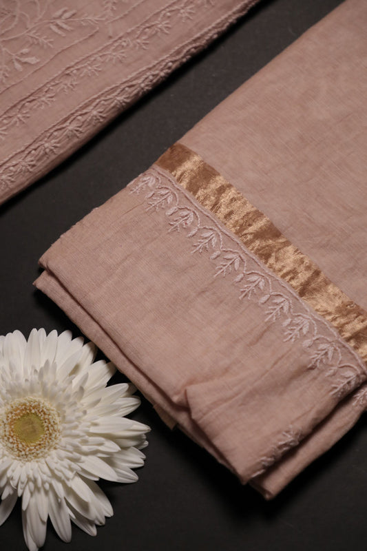 Nude Peach Mul Chanderi Unstitched Chikankari Suit Set