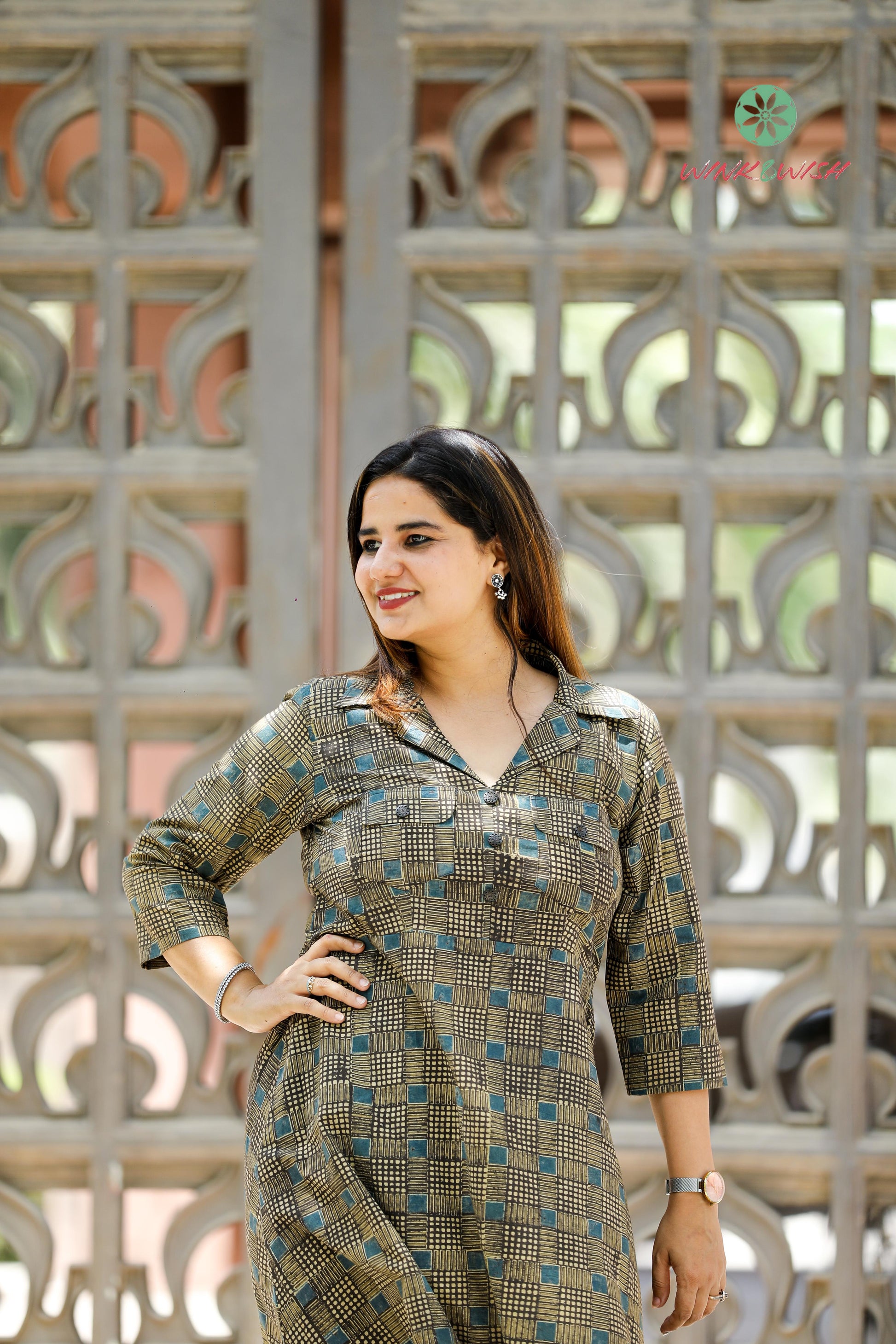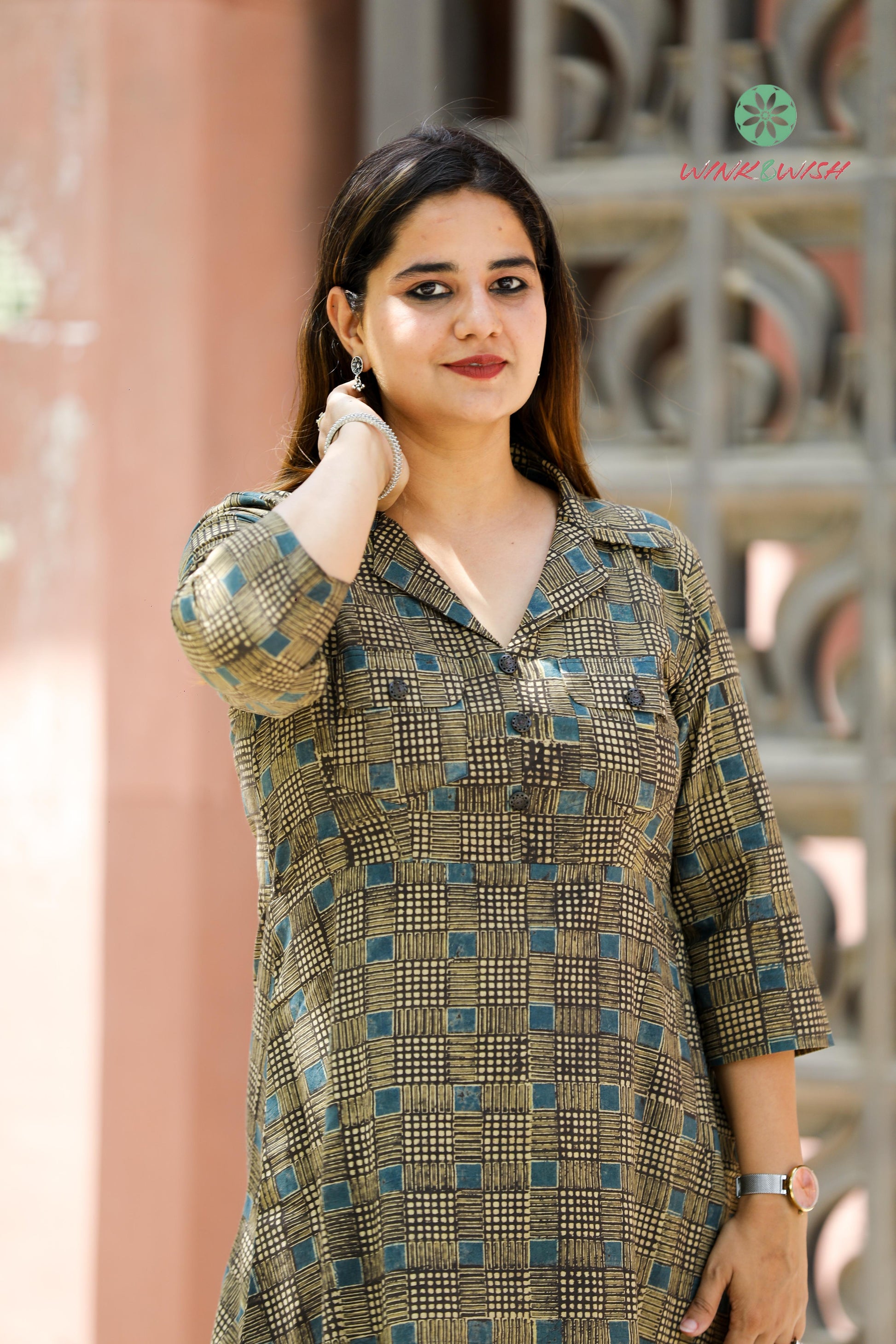 Meticulously hand block printed by skilled artisans to create a beautiful check pattern in bohemian hues of earthy brown, black, and azure blue, the dress adds smartness and sparkle to your look.