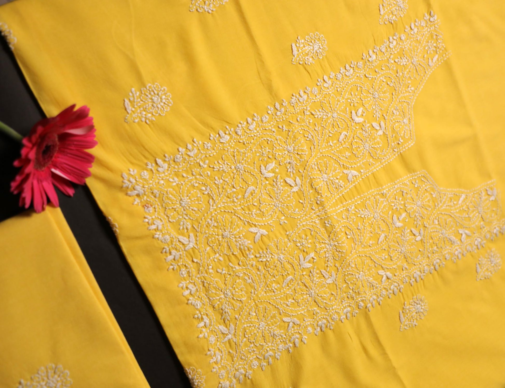 Elevate your wardrobe with our Cheerful Yellow Mul Cotton Chikankari Kurta fabric. Made from soft cotton, this playful yellow fabric features intricate hand embroidery that adds a touch of elegance to any outfit. Express your unique style and stand out with this elegant piece of hand work