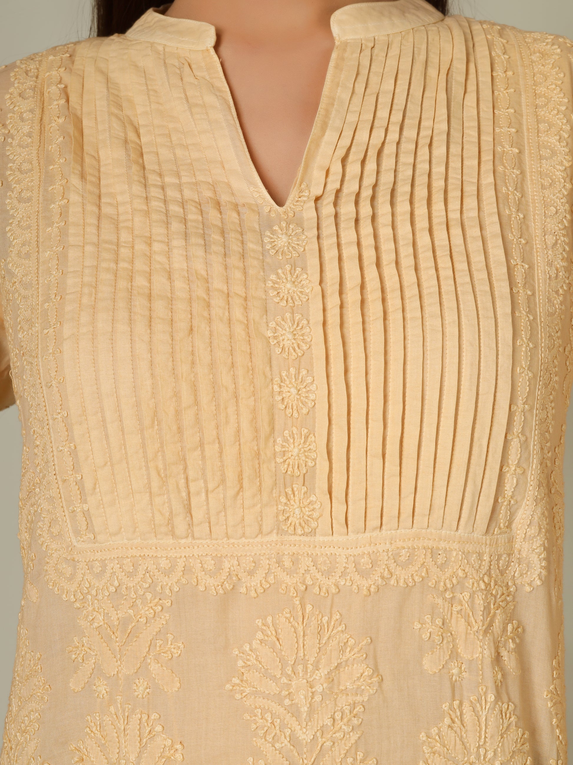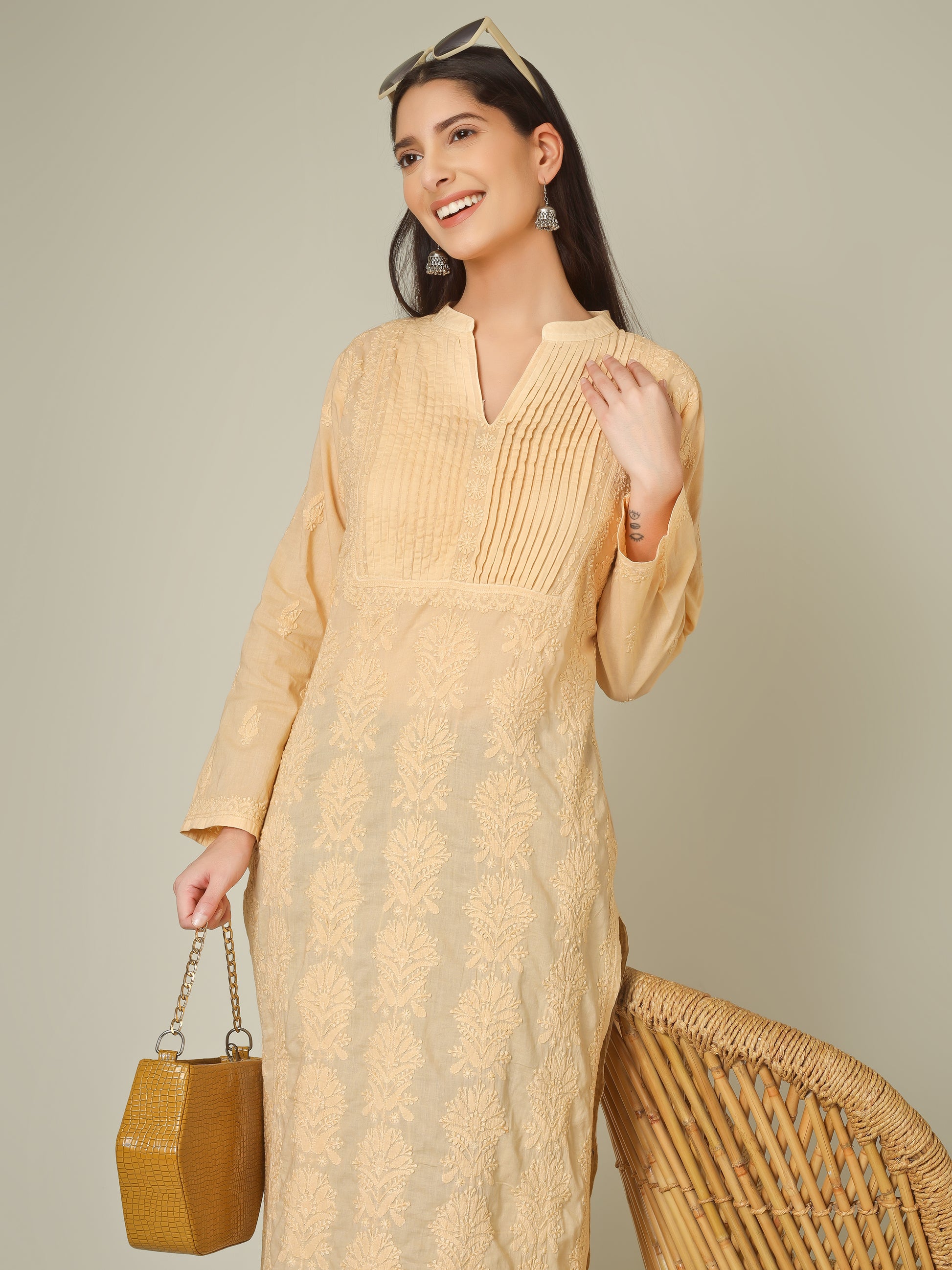 'Classy Beige' Pleated Band Neck Mul Cotton Chikankari Long Kurti