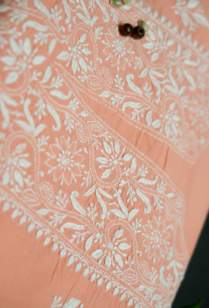 Create your own summer style with our Cozy Peach Chikankari Kurta fabric. Made from soft cambric cotton, it offers both comfort and elegance. The warm peach color adds a touch of warmth to your outfit, the fine chikankari embroidery adds that elegance.
