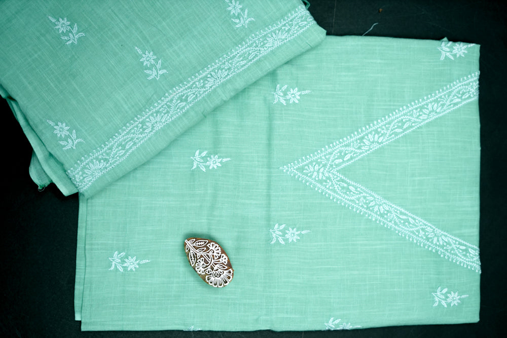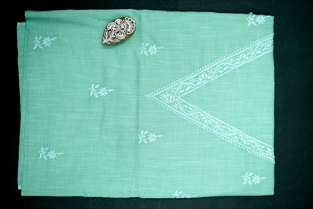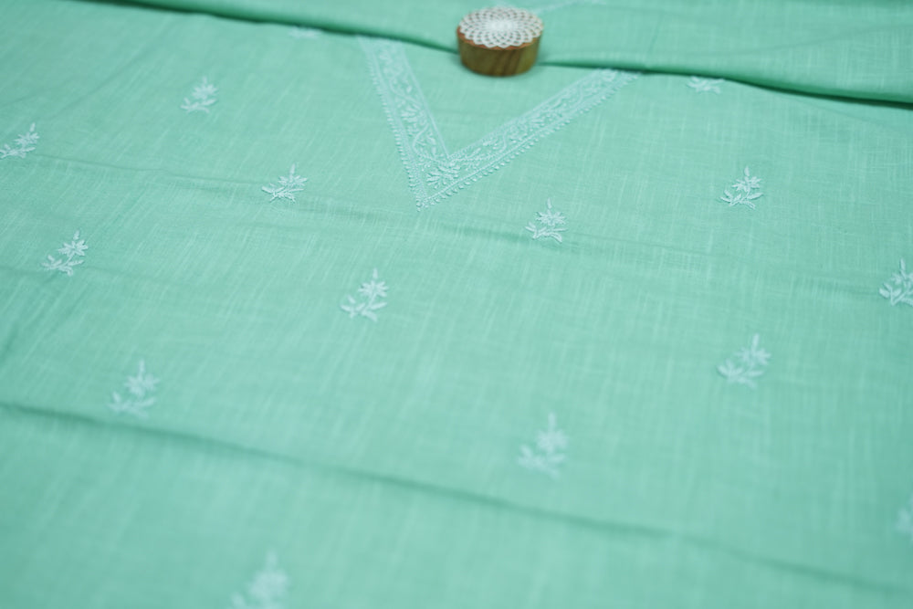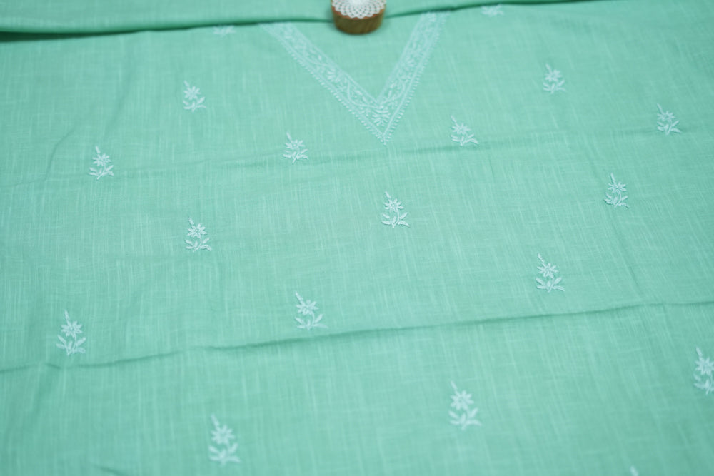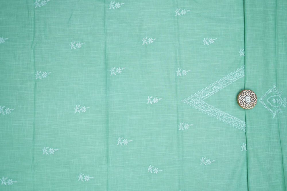 'Elegant Pista Green' V-neck Cotton Unstitched Chikankari Kurta Pant Set