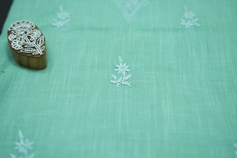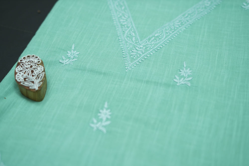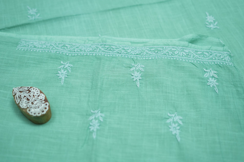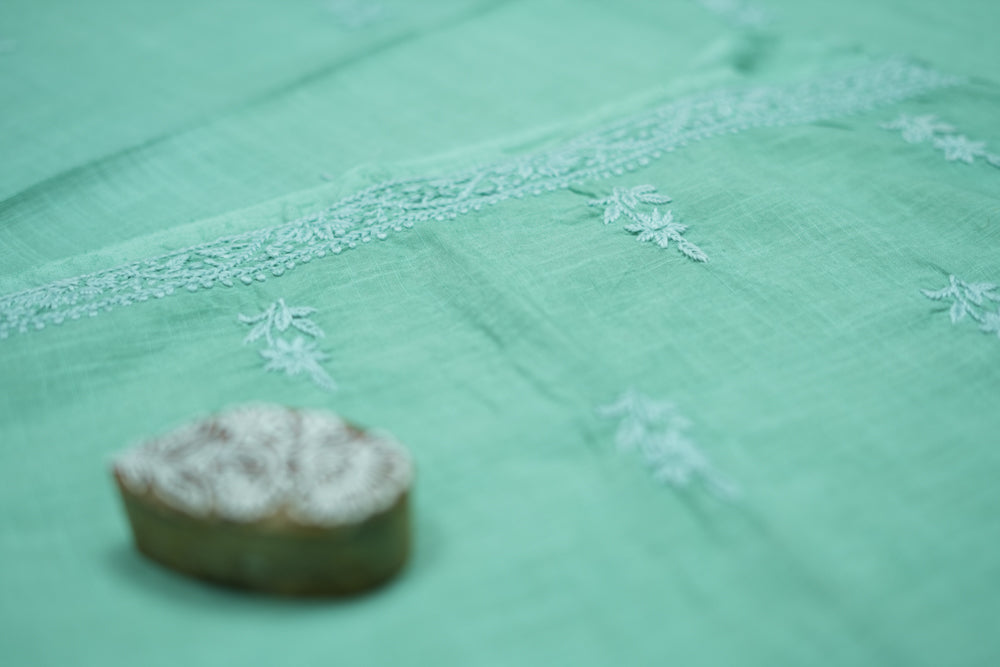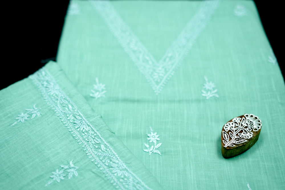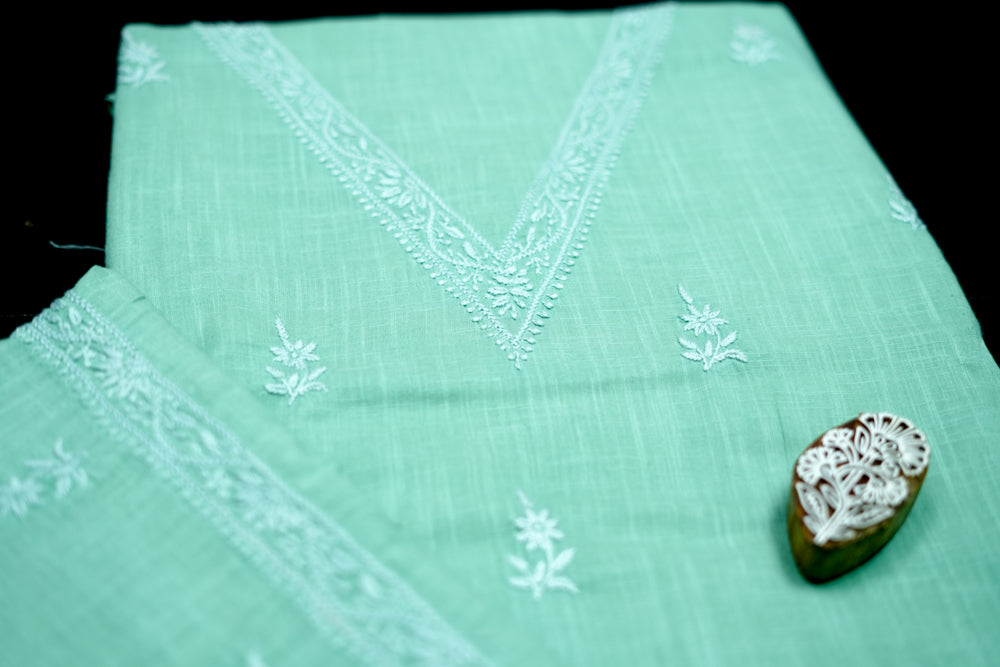 'Elegant Pista Green' V-neck Cotton Unstitched Chikankari Kurta Pant Set