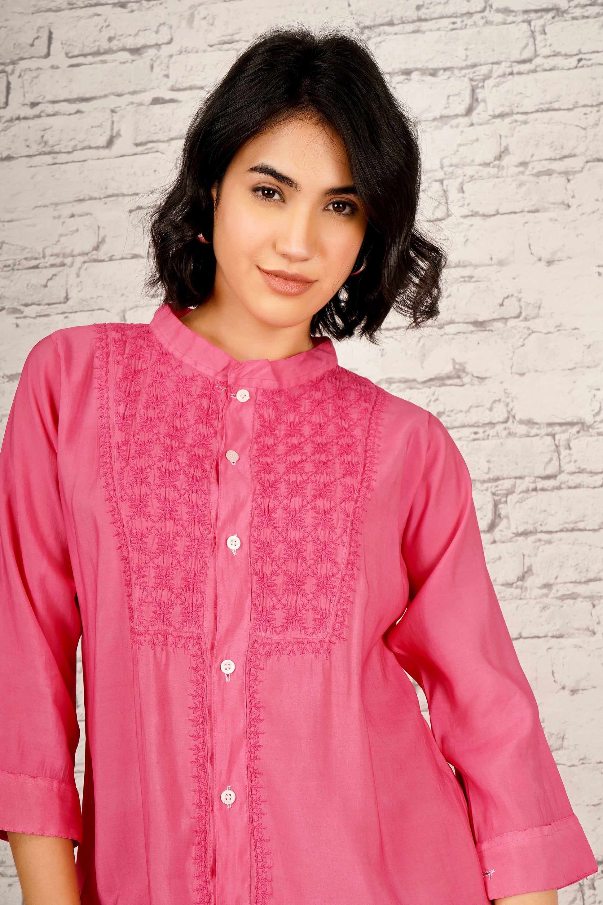 'Timeless Tulip' Cotton Pink Chikankari Shirt