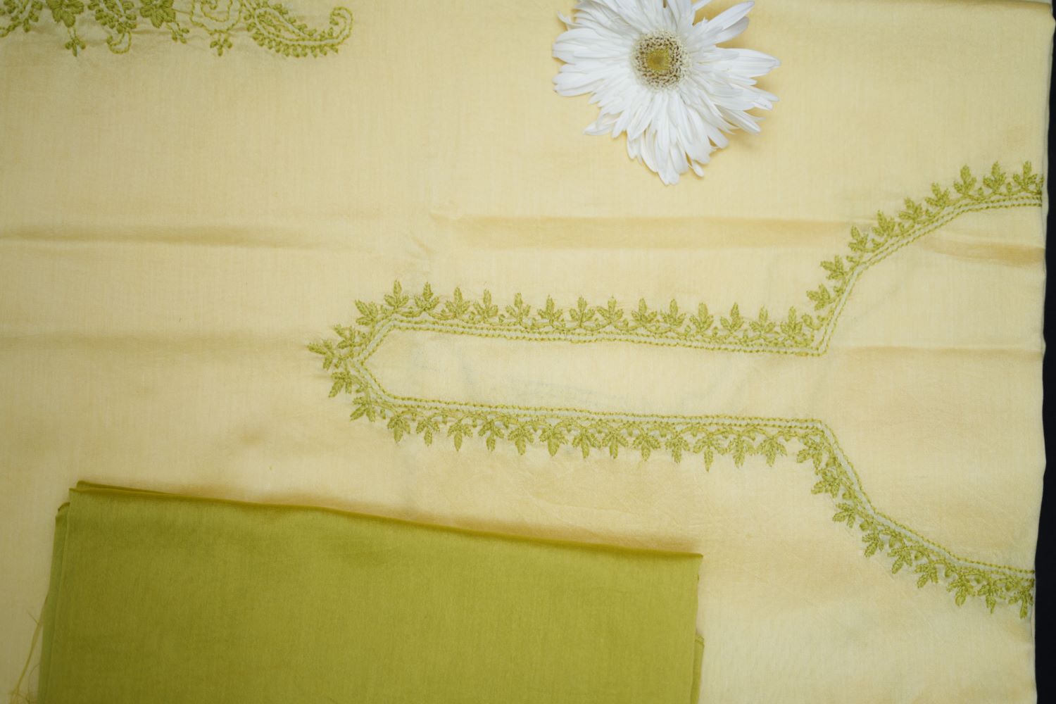 This elegant 'Whispers of Spring' KAIRI co-ord set features delicate olive green embroidery over a soft pastel yellow base, merging boldness with gentle grace. The intricately crafted statement kairi motifs adorn the front panel and sleeves, highlighting artisanal chikankari craftsmanship.