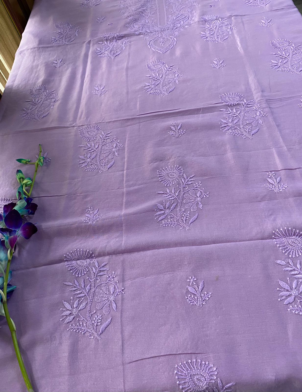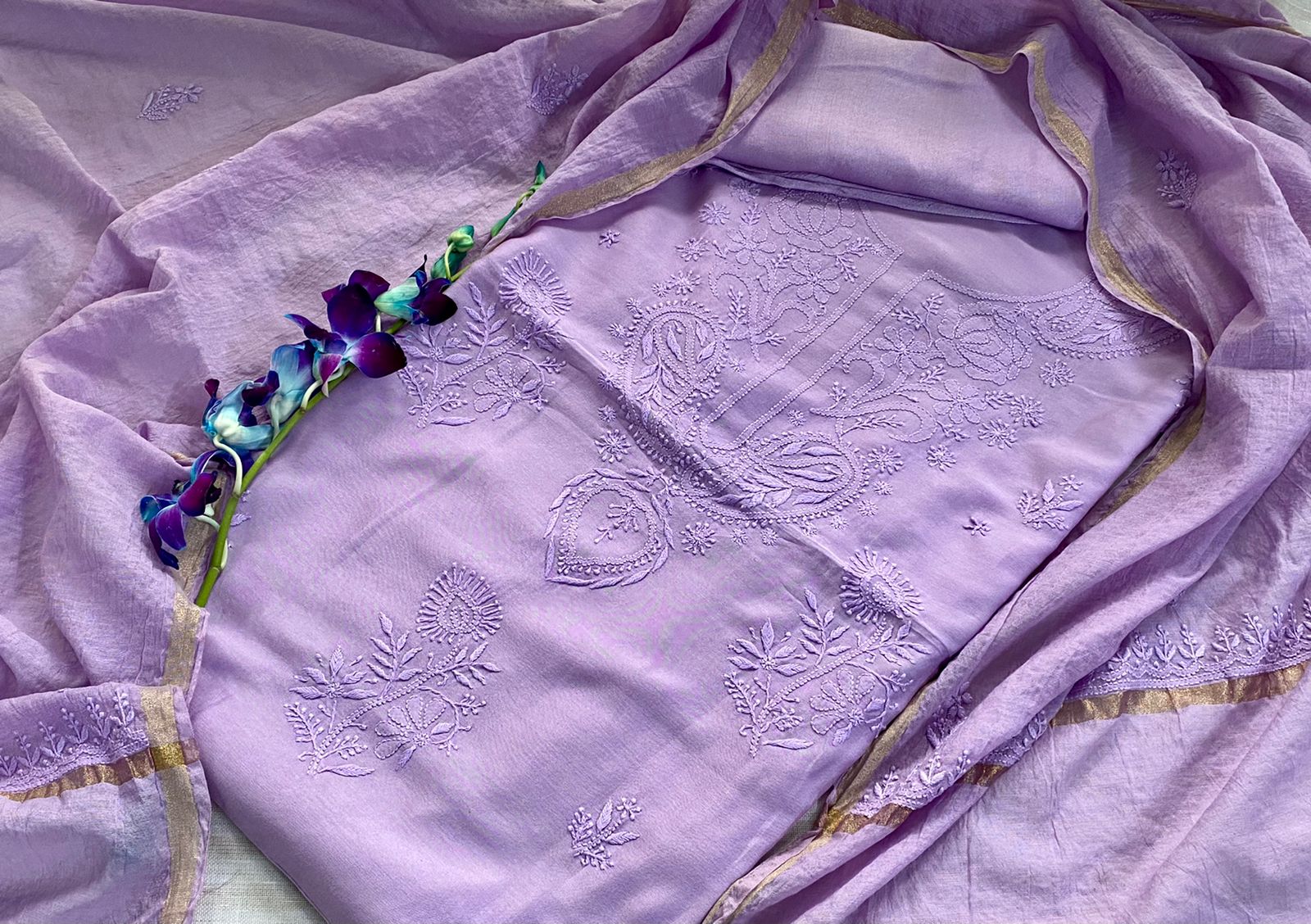 Lilac elegant Chanderi Kurta-Dupatta set with fine quality Chikankari embroidery. Perfect to adorn for all types of occasions.