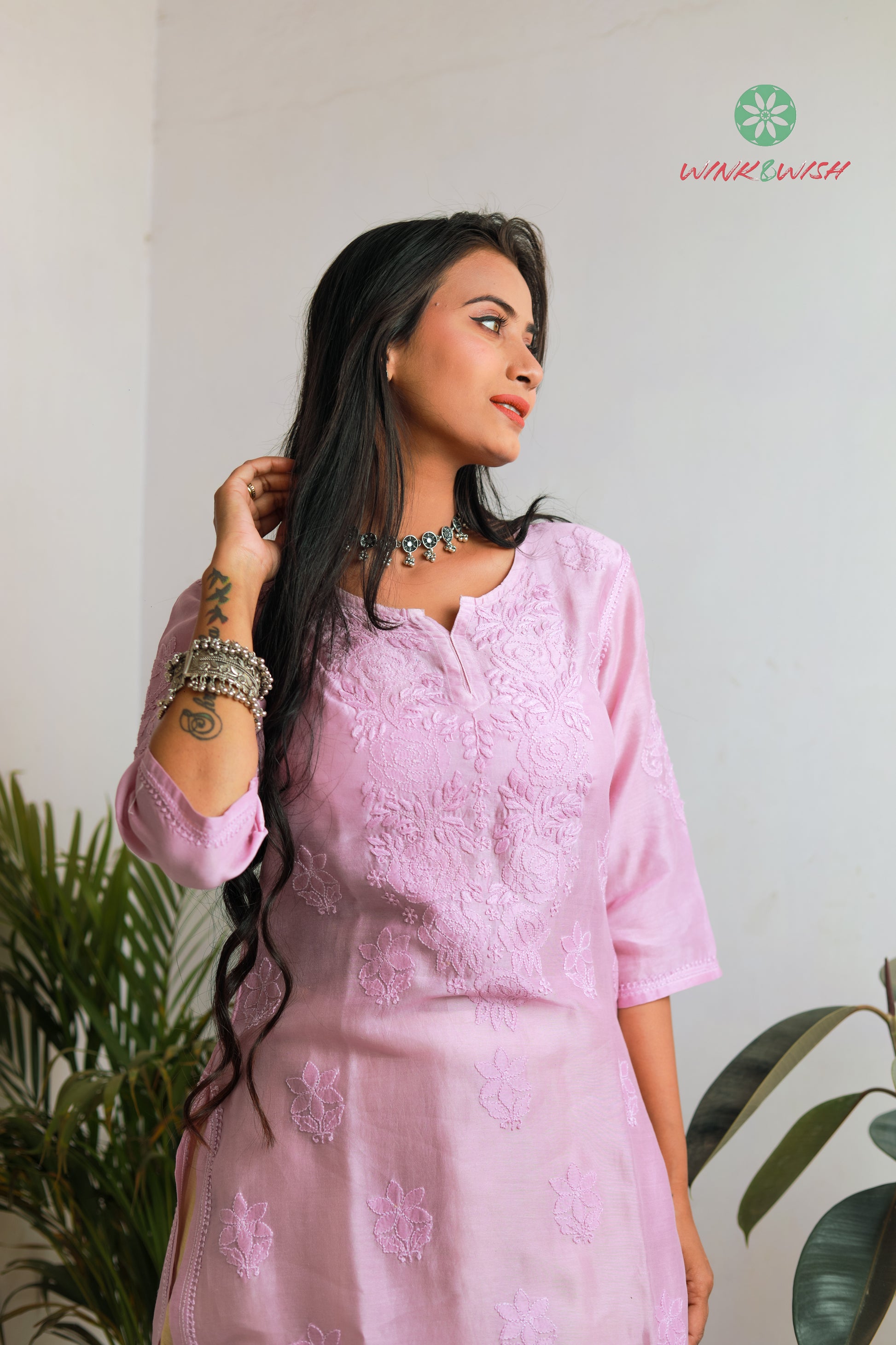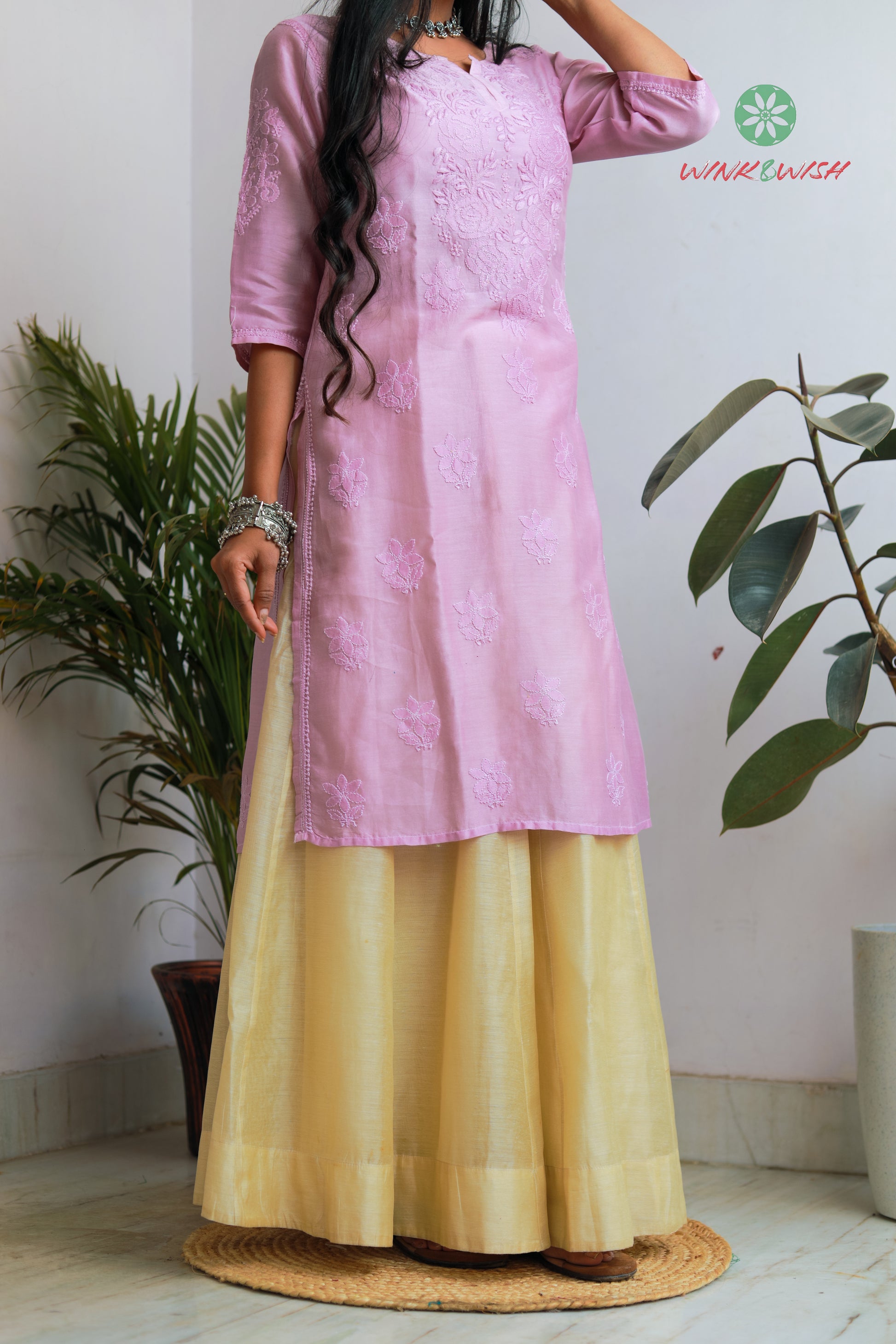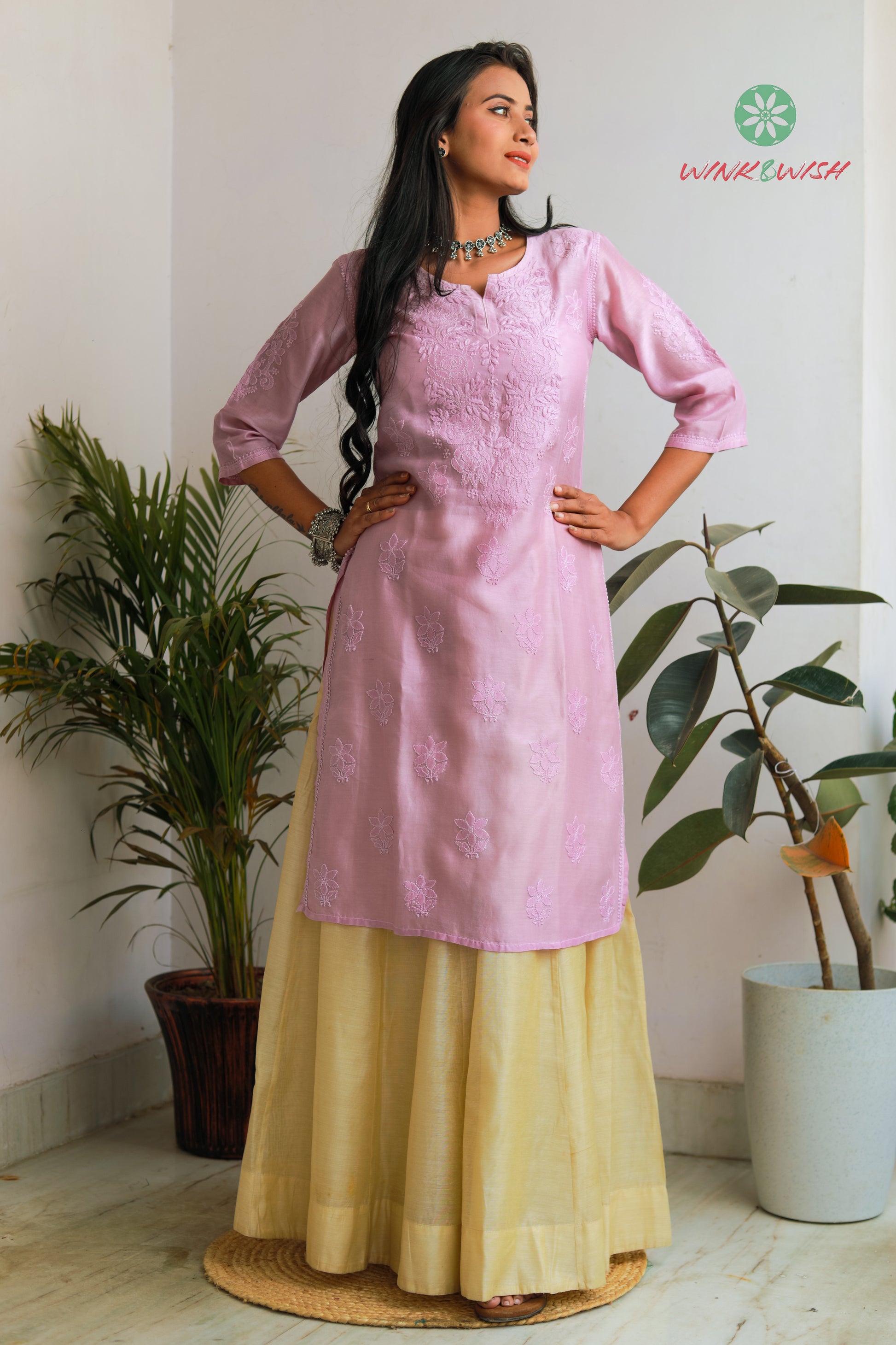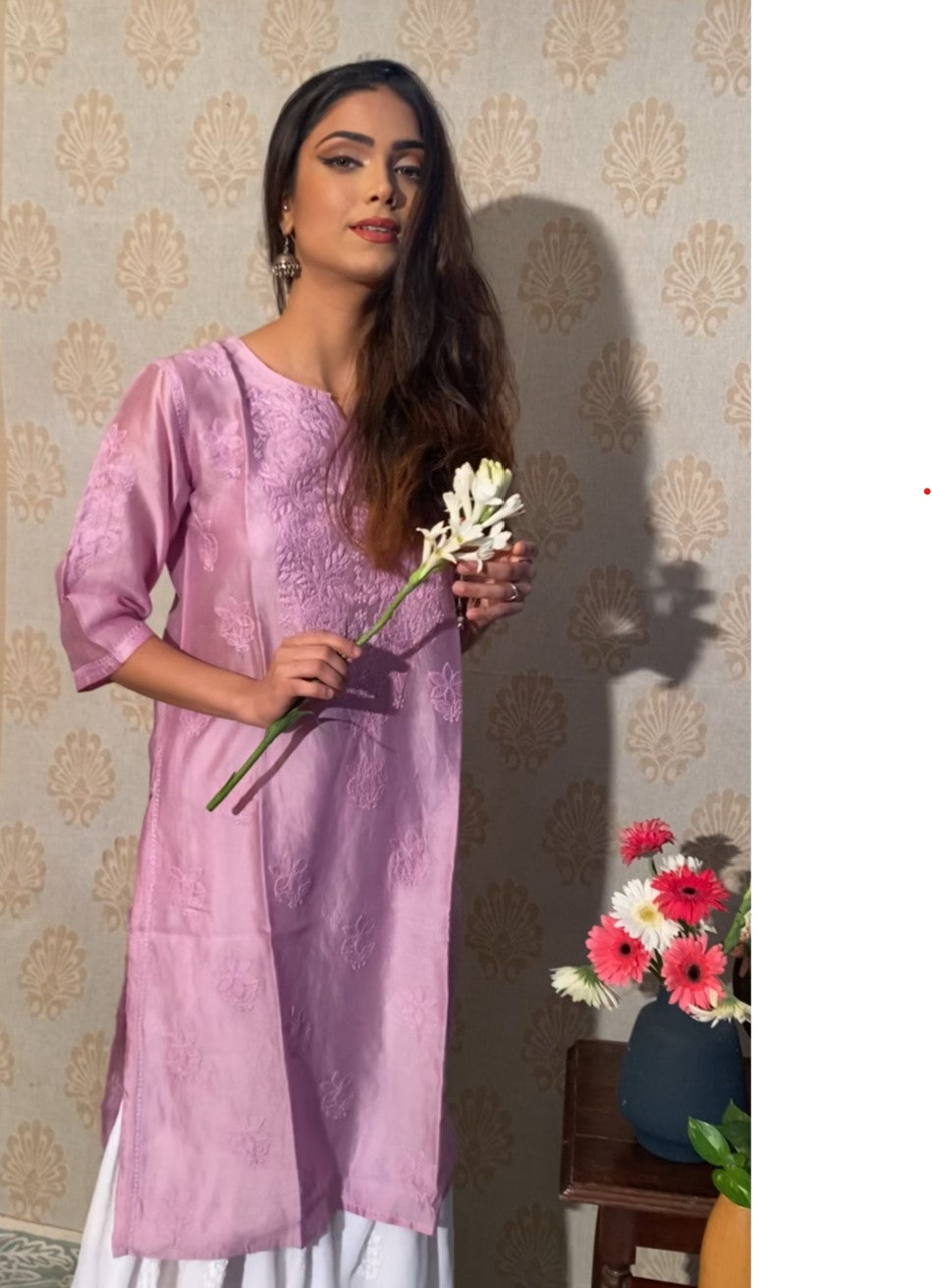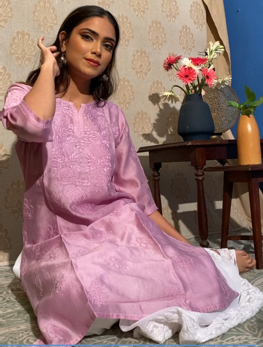 Lilac Rose pattern Chikankari embroidered Chanderi Kurti