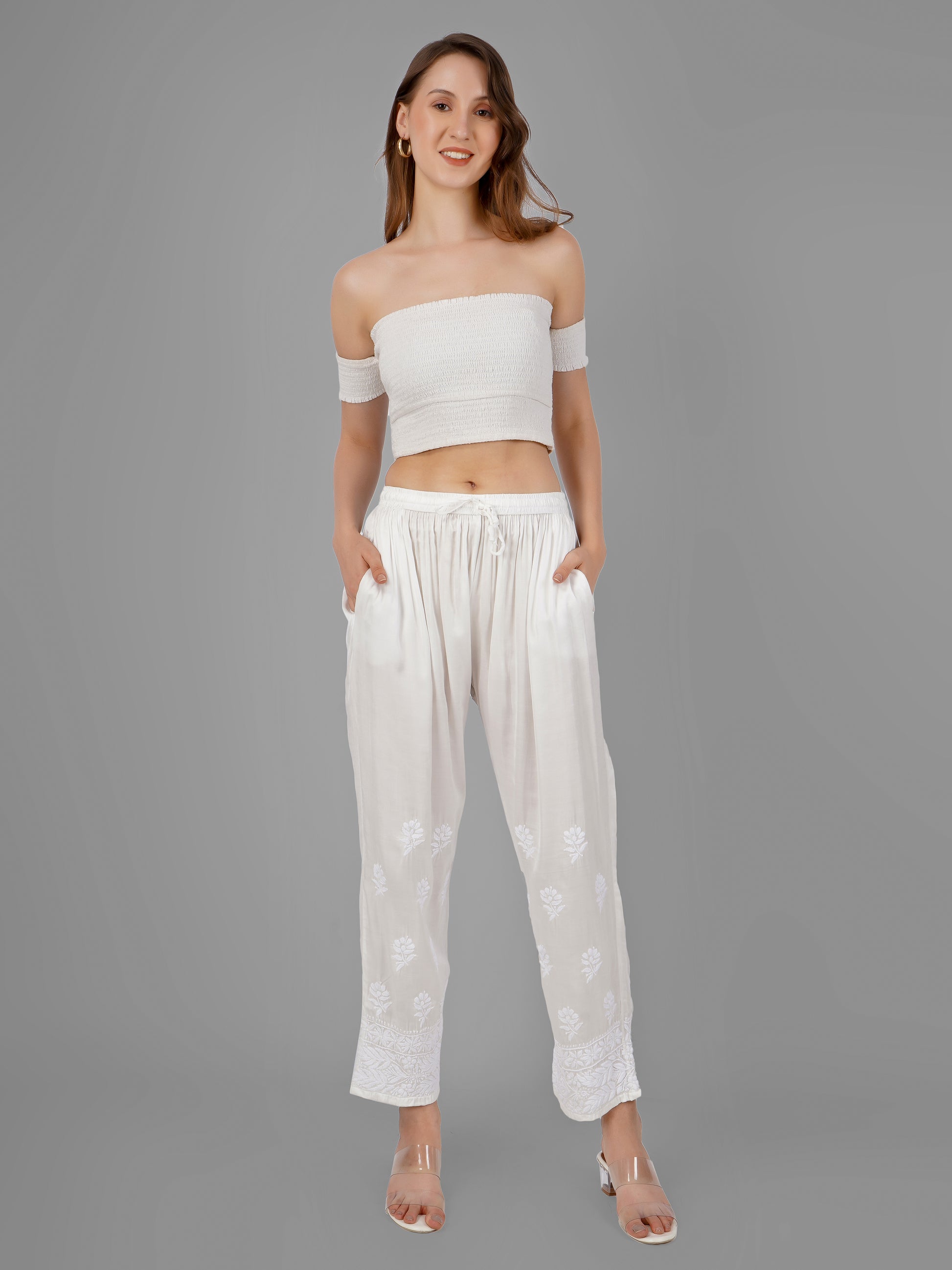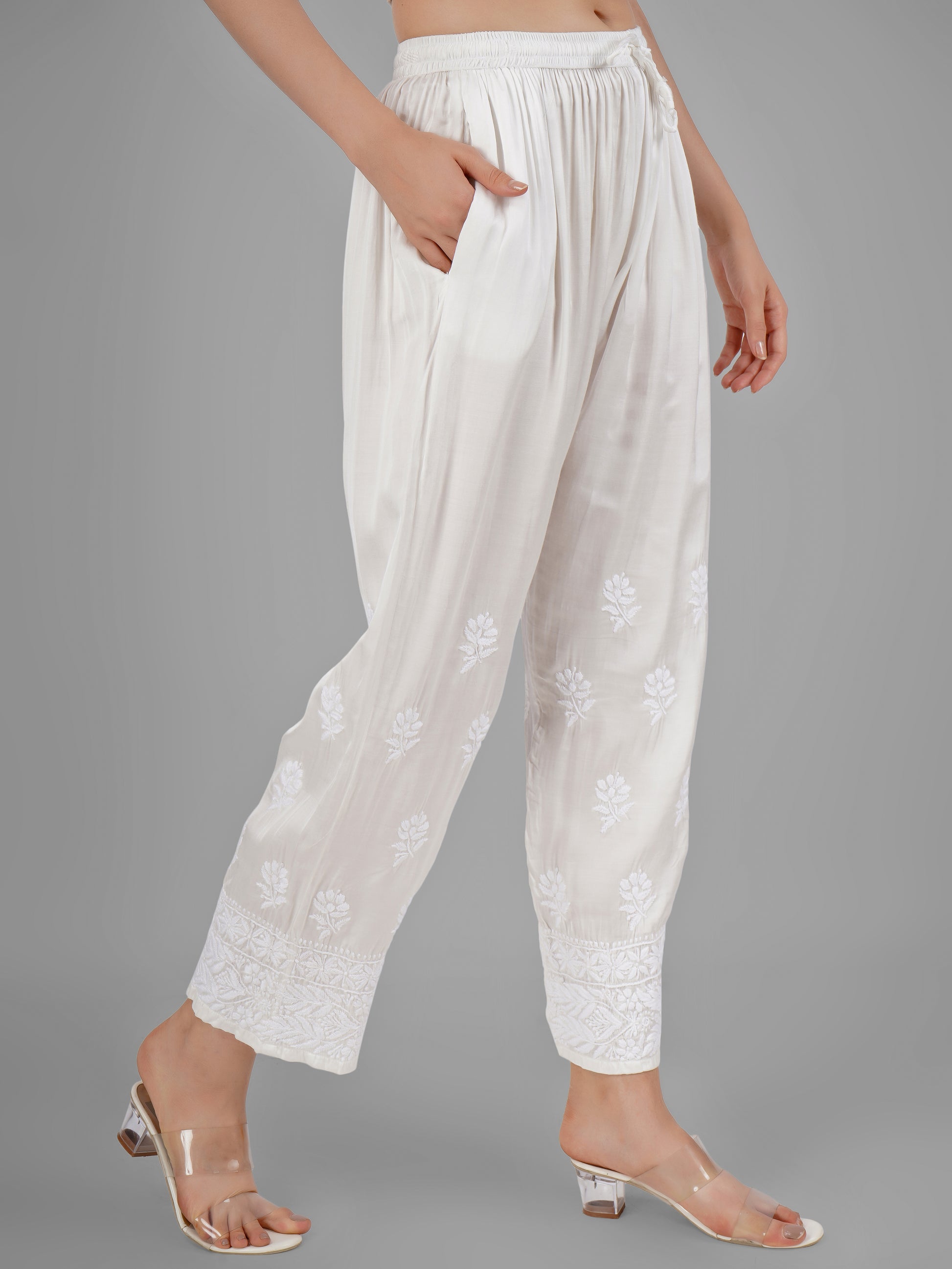 This sheen pant in luxurious modal satin fabric with chikankari work at the bottom is perfect for pairing with your chikankari georgette, crepe, muslin or modal satin kurtis.