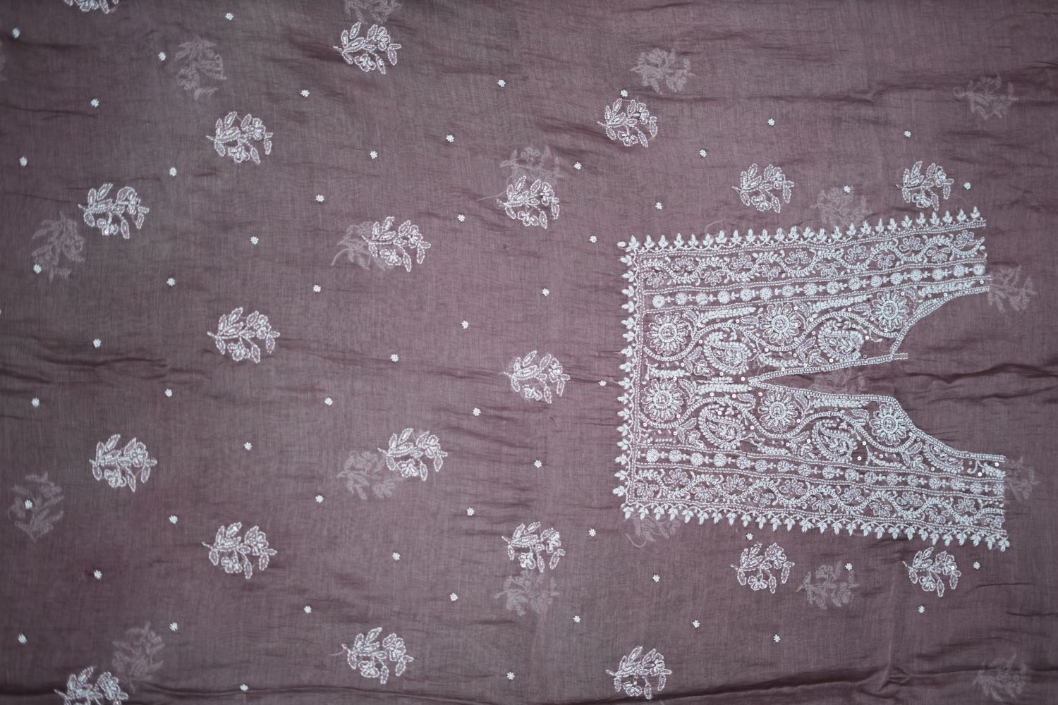 'Old World Charm' Bistre Brown Hand-Embroidered Hand Embellished Mul Chanderi Chikankari Unstitched Suit Set