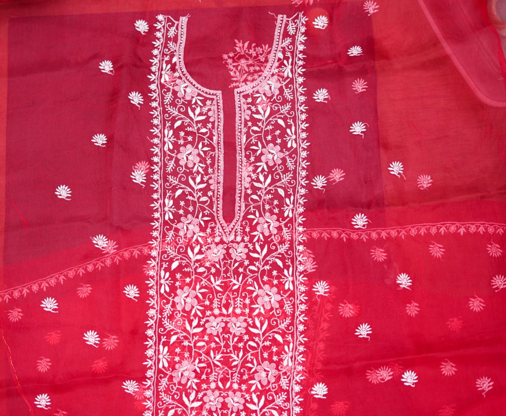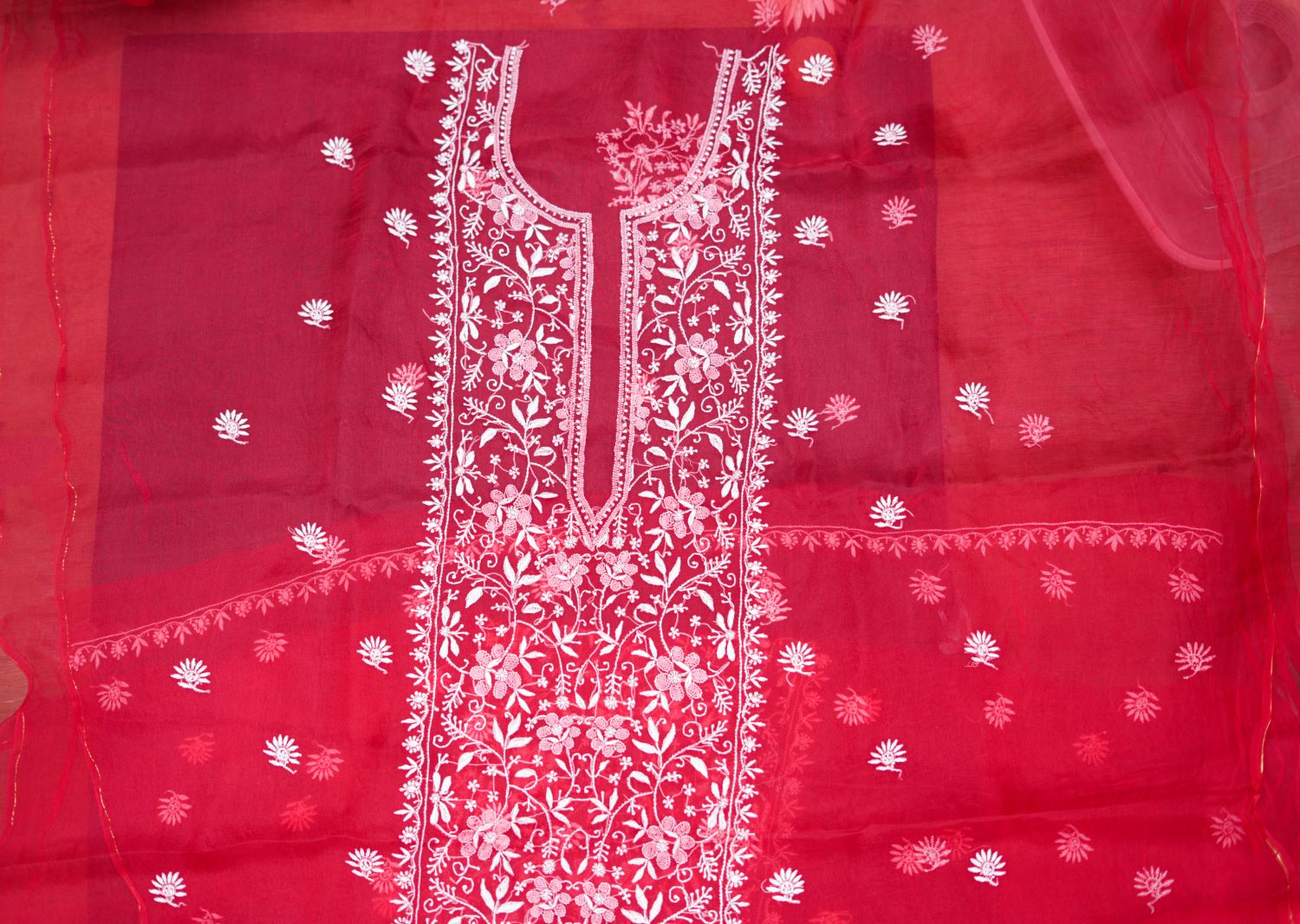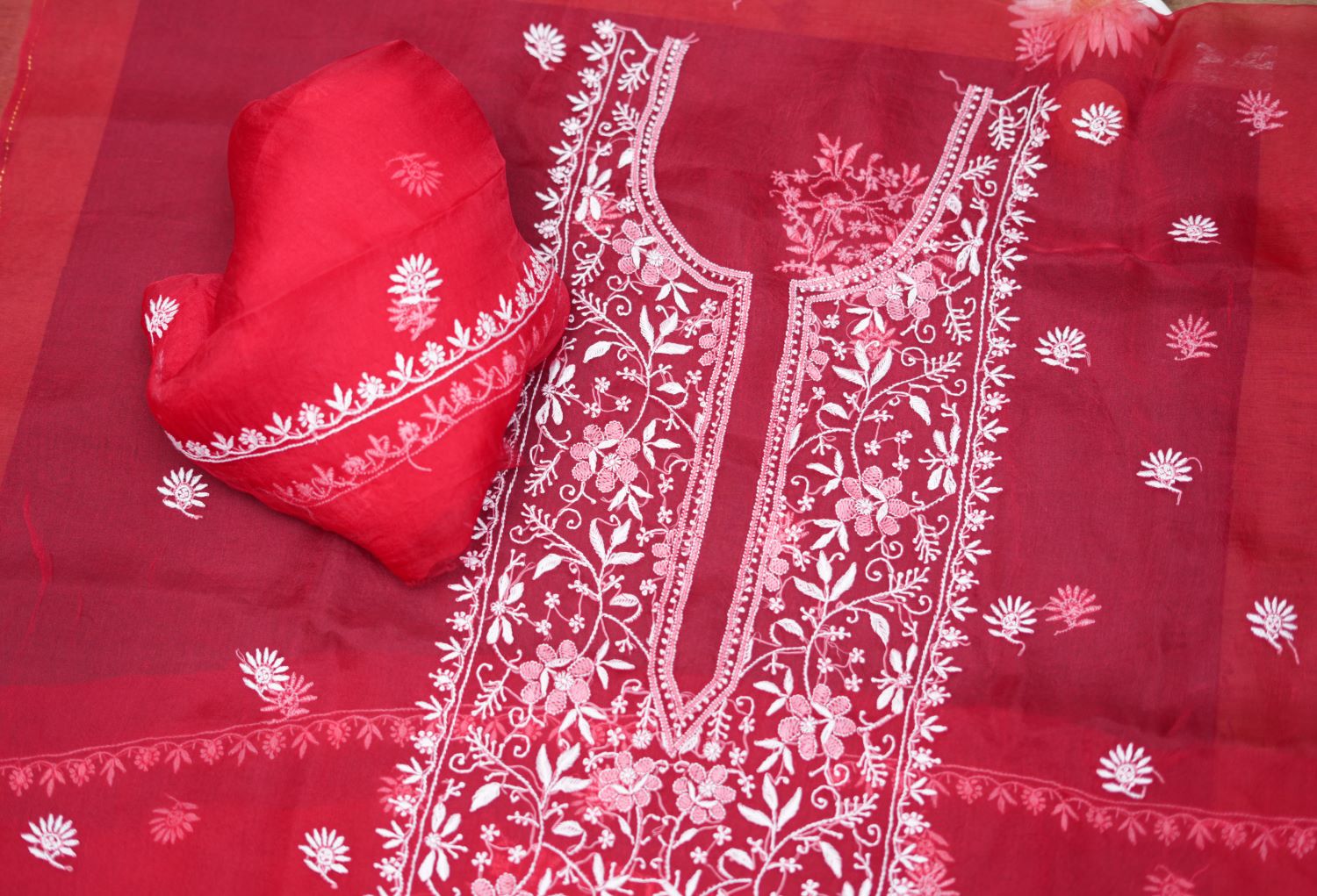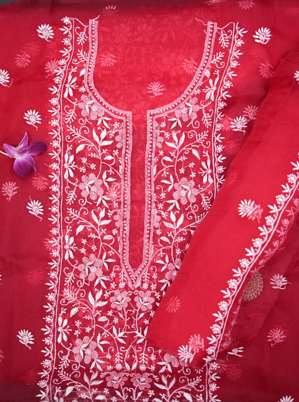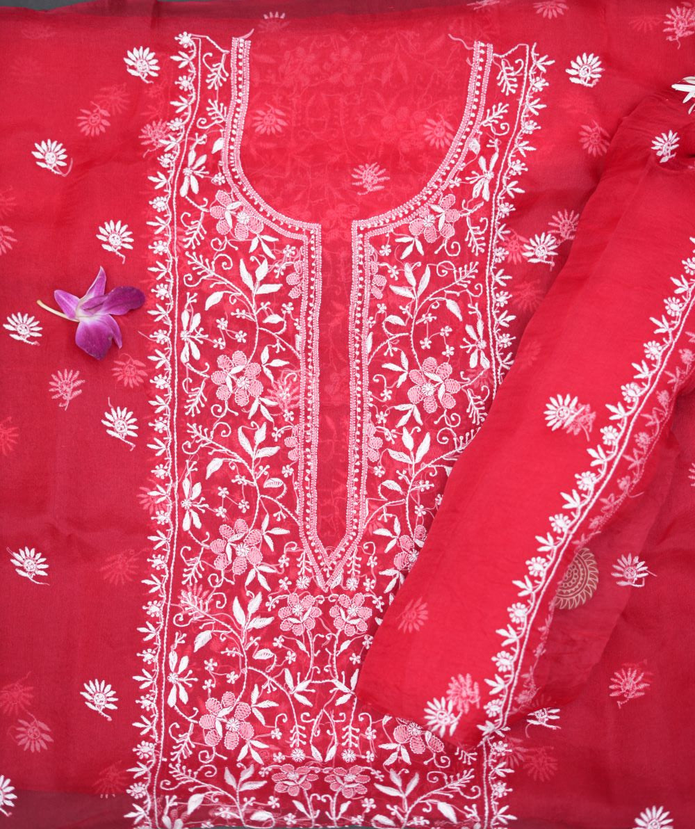 'Poppy Red' Pure Organza Unstitched Chikankari Suit Set