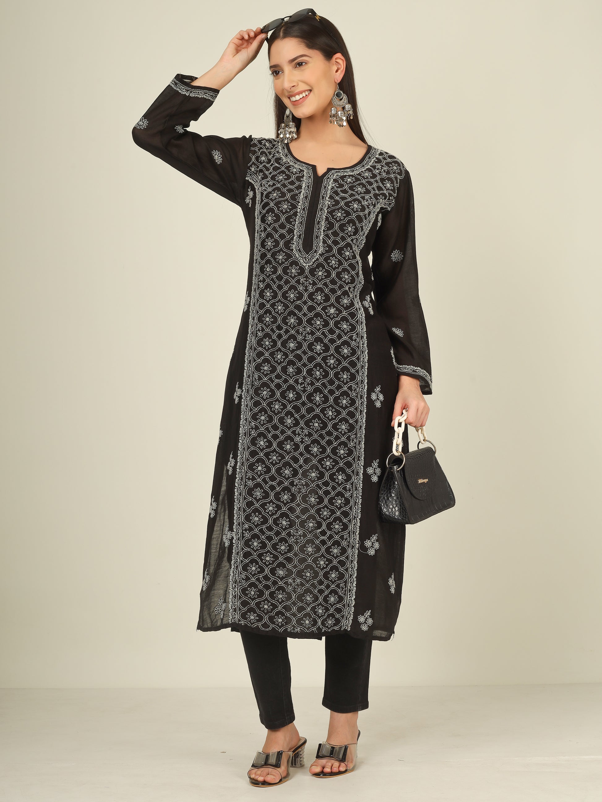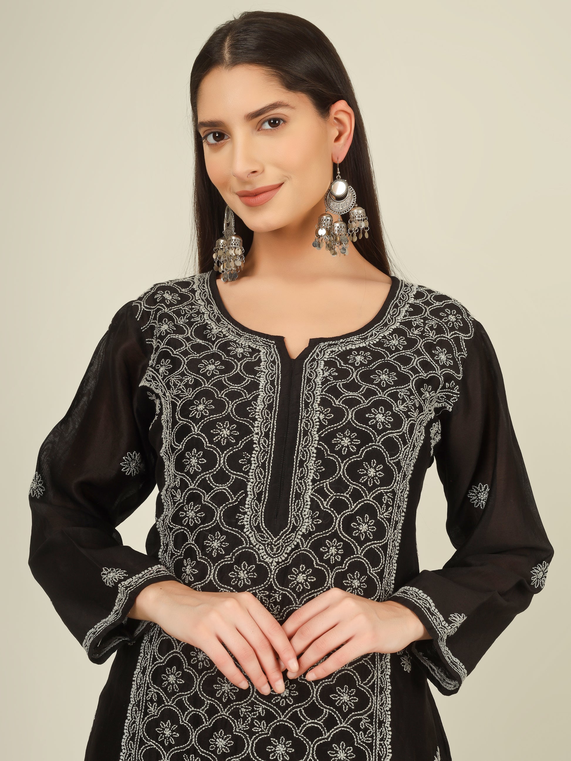 'Starry Night' Mul-chanderi Black Chikankari Long Kurti
