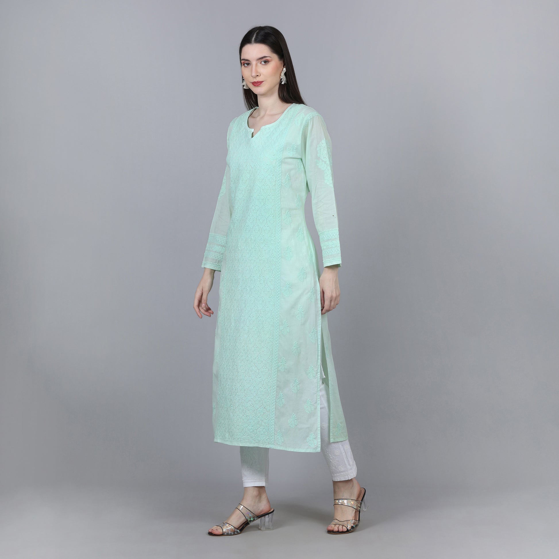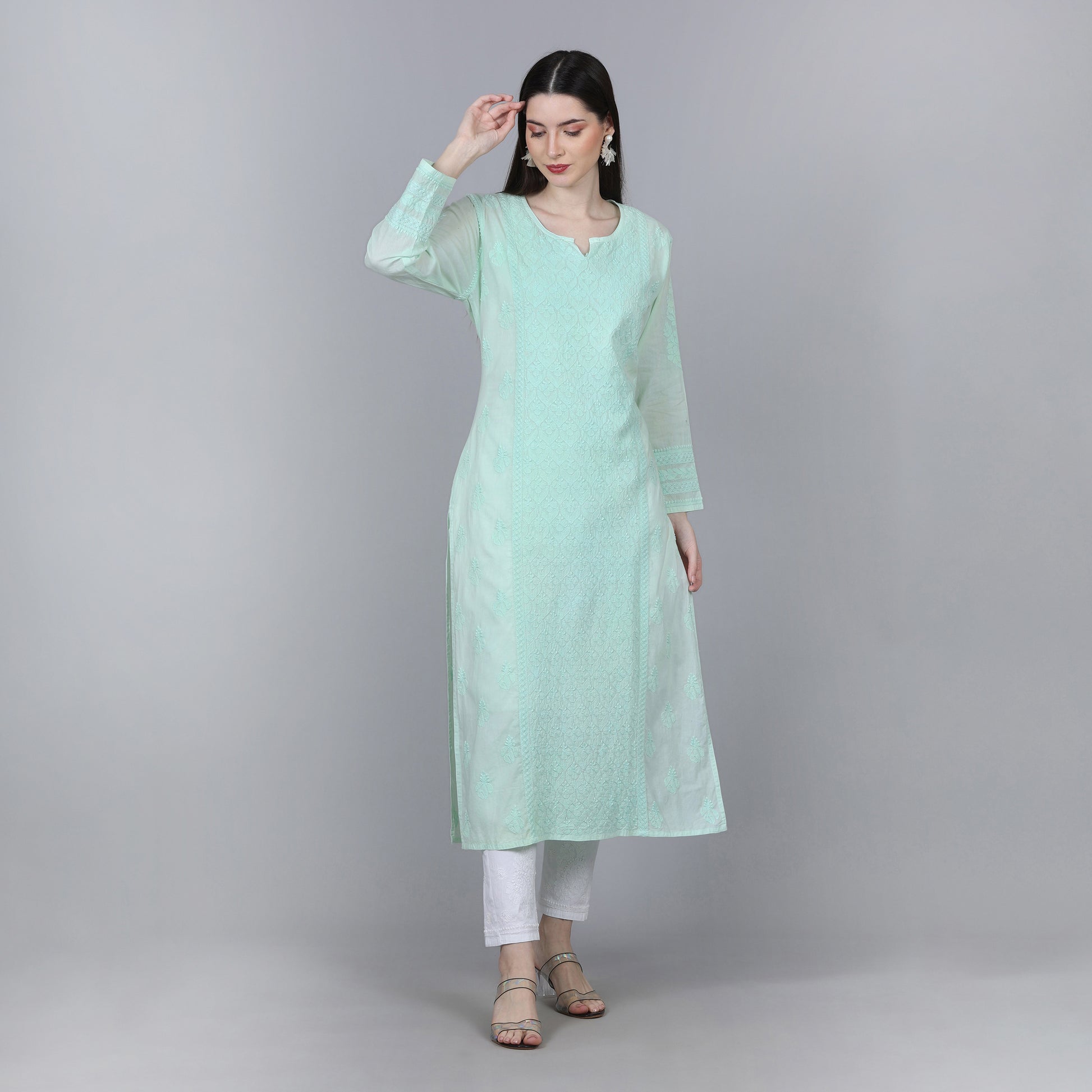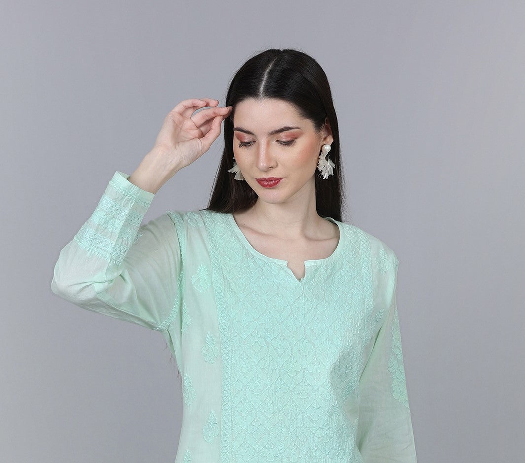 Summer Perfect Pastel Green Chikankari Mul Cotton Kurti