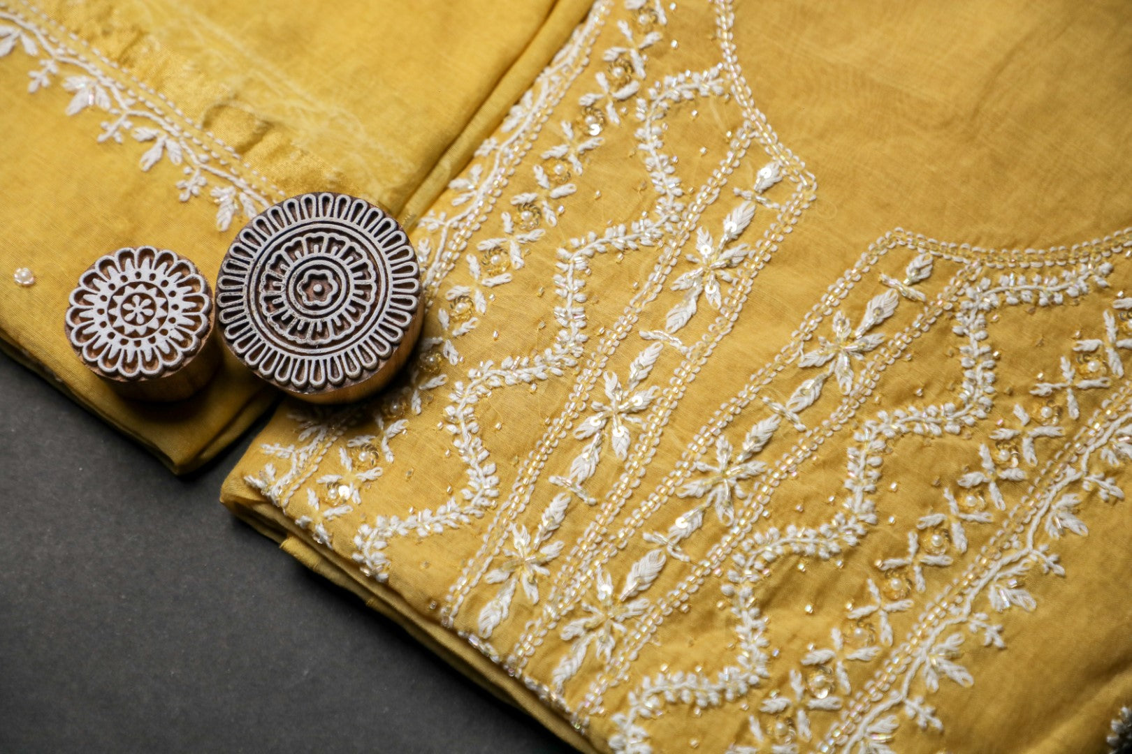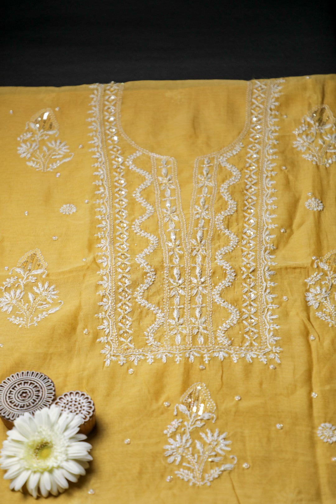 'Sunset Gold' Mul Chanderi Embellished Unstitched Chikankari Suit Set